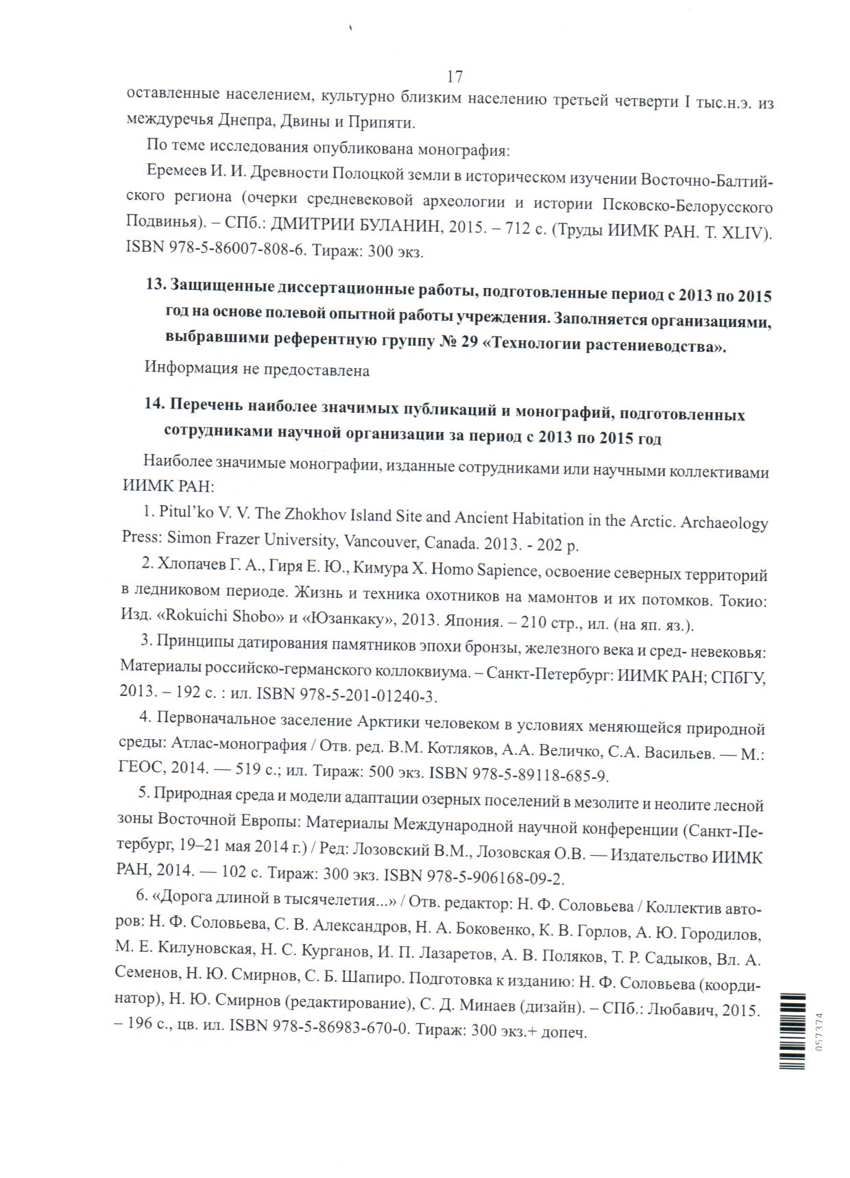 Опубликован Бюллетень Института истории материальной культуры РАН. [№] 15 (охранная археология)