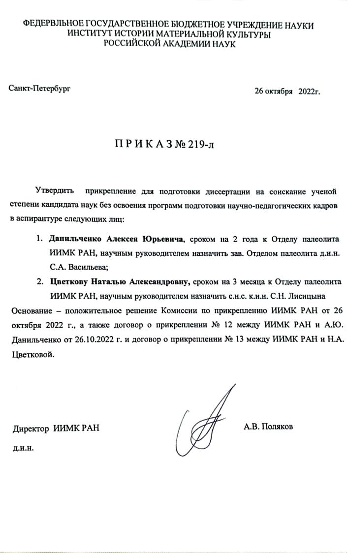 Приказ о прикреплении А.Ю. Данильченко и Н.А. Цветковой