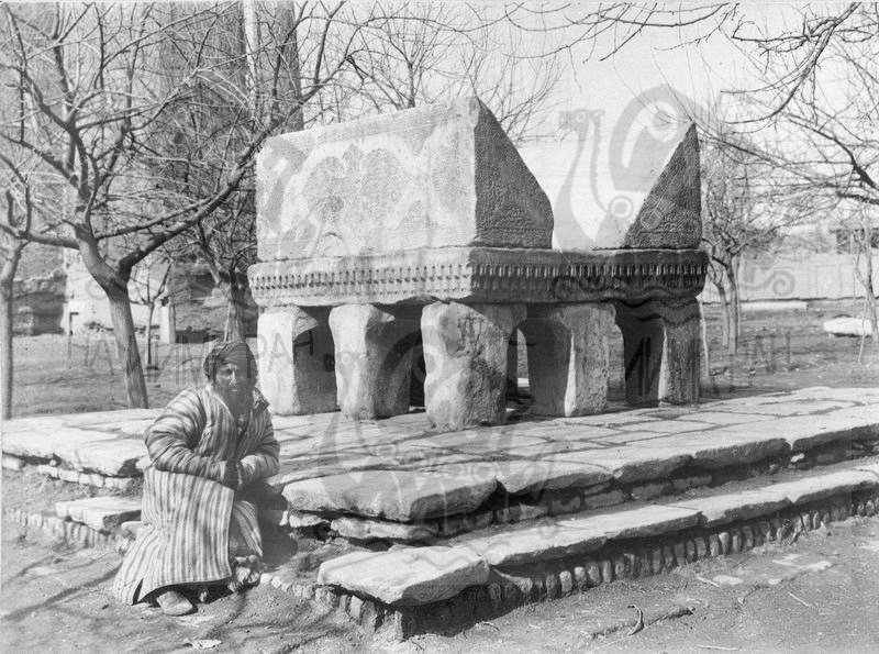 Самарканд. Узбекская ССР. Медресе Биби-Ханым: мраморный пюпитр для Корана во дворе. Снимок фотографа-любителя Г. А. Панкратьева, 1894 г.