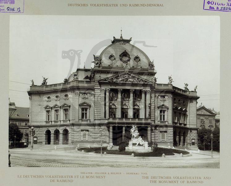 Здание Немецкого народного театра, общий вид лицевого фасада с памятником венскому поэту Фердинанду Раймунду, установленный в 1898 г