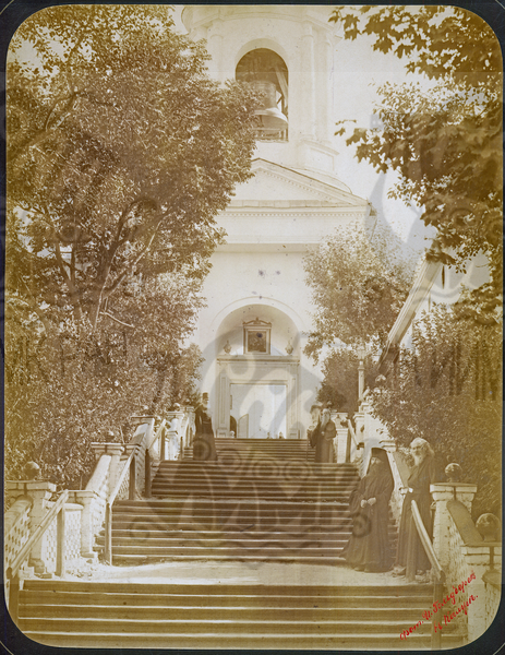 Q.164 -2 Оптина Введенская Макарьева пустынь близ г.Козельска. Вид лестницы и святых ворот под колокольней. Снимок Гольдберга, май 1887 года.