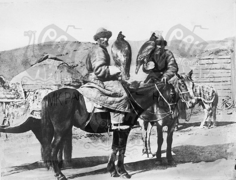 Семипалатинская область. Два всадника на лошадях - киргизы-охотники с беркутами.