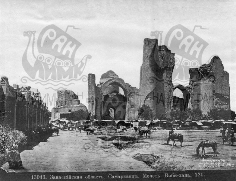 Самарканд. Узбекистан. Биби-Ханым: общий вид входного портала, большой и малой мечети с базарной площади.