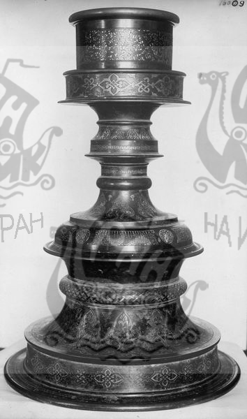 г. Туркестан. Подсвечник медный с широким основанием из мечети Хаджи Ахмеда Ясави: общий вид. Издано у А. Ю. Якубовского «Мастера Ирана в Средней Азии при Тимуре», таблица C XX.