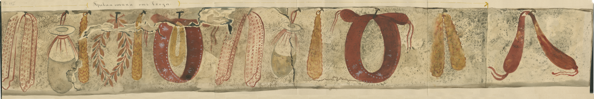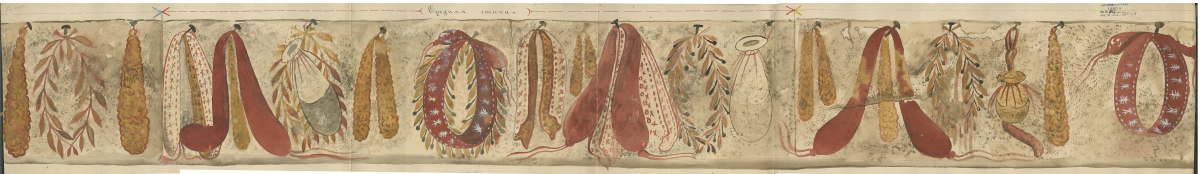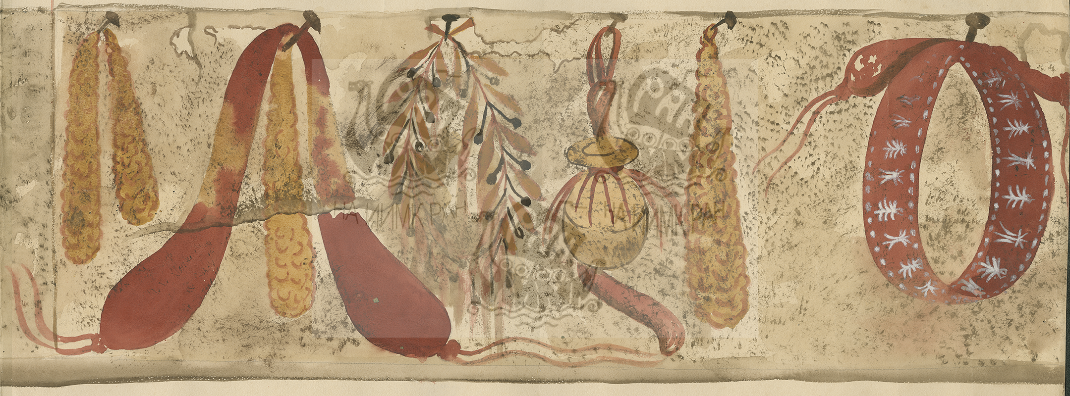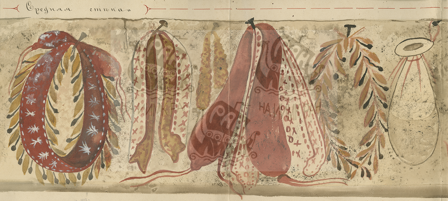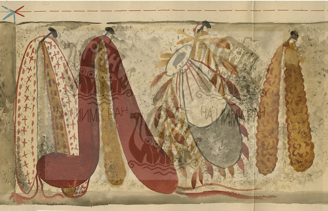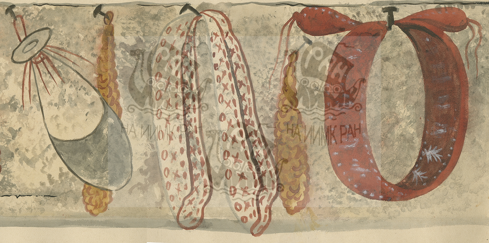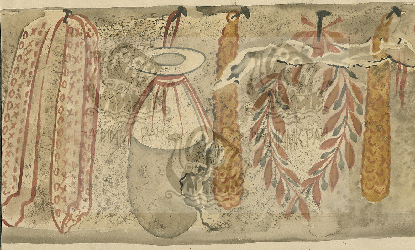 Керчь. Склеп 1908 г. Части фриза с изображением венков, повязок, сосудов для масел. Акварель, полуватман. Фрагмент.