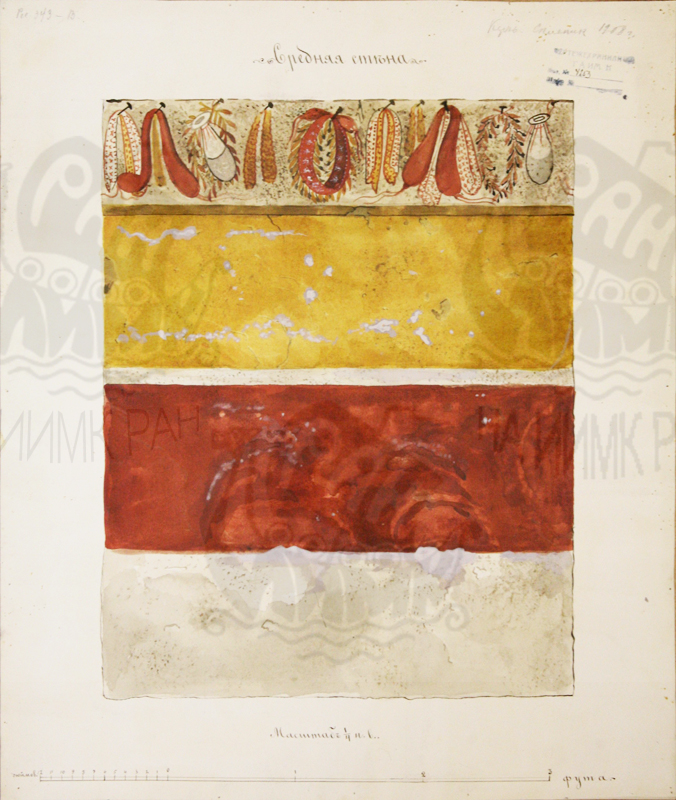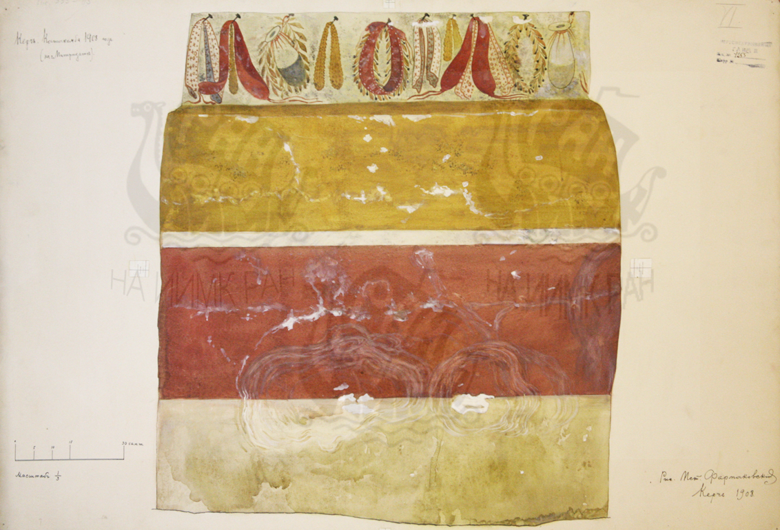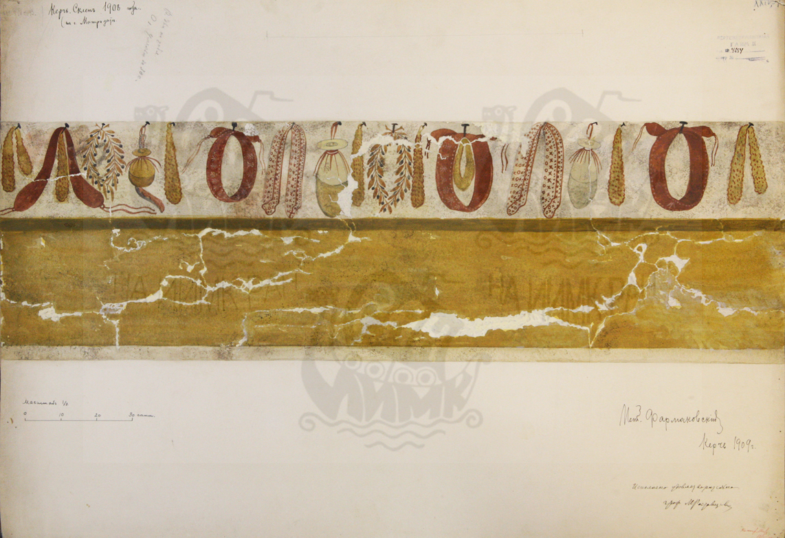 | Керчь. Склеп 1908 г. Фрагмент росписи. Рисунок М. В. Фармаковского, 1909 г. Картон, акварель. |
