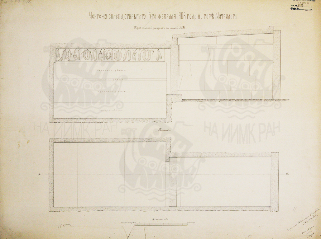 Керчь. План и разрез склепа 1908 г. Выполнен технологом С. К. Соколовым 1 июля 1908 г. Бумага, тушь.