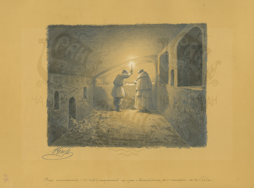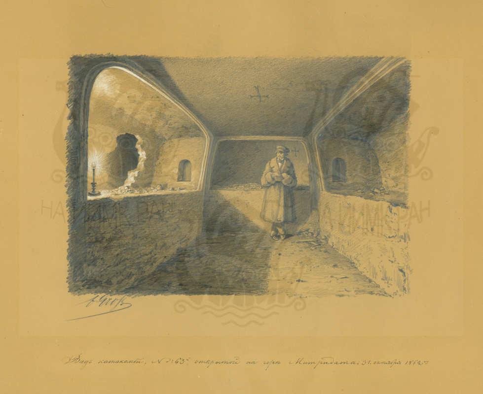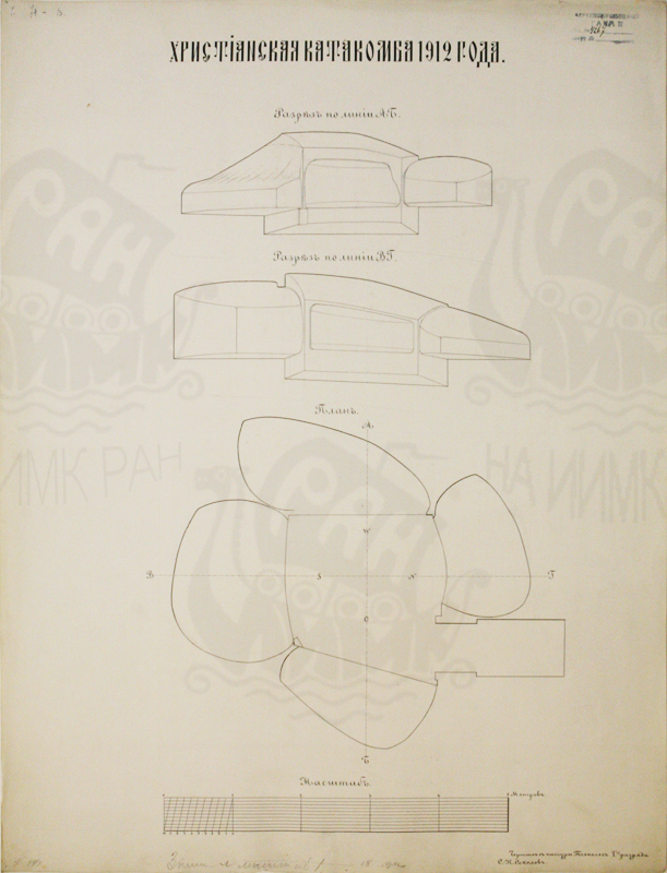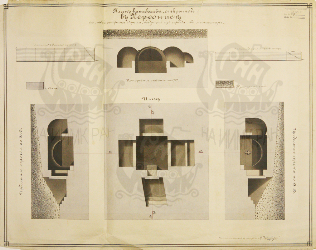 «План христианской катакомбы, открытой в Херсонесе с левой стороны дороги, ведущей из города в монастырь. Чертил и снимал с натуры М. Скубетов».