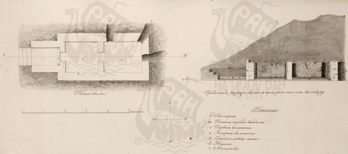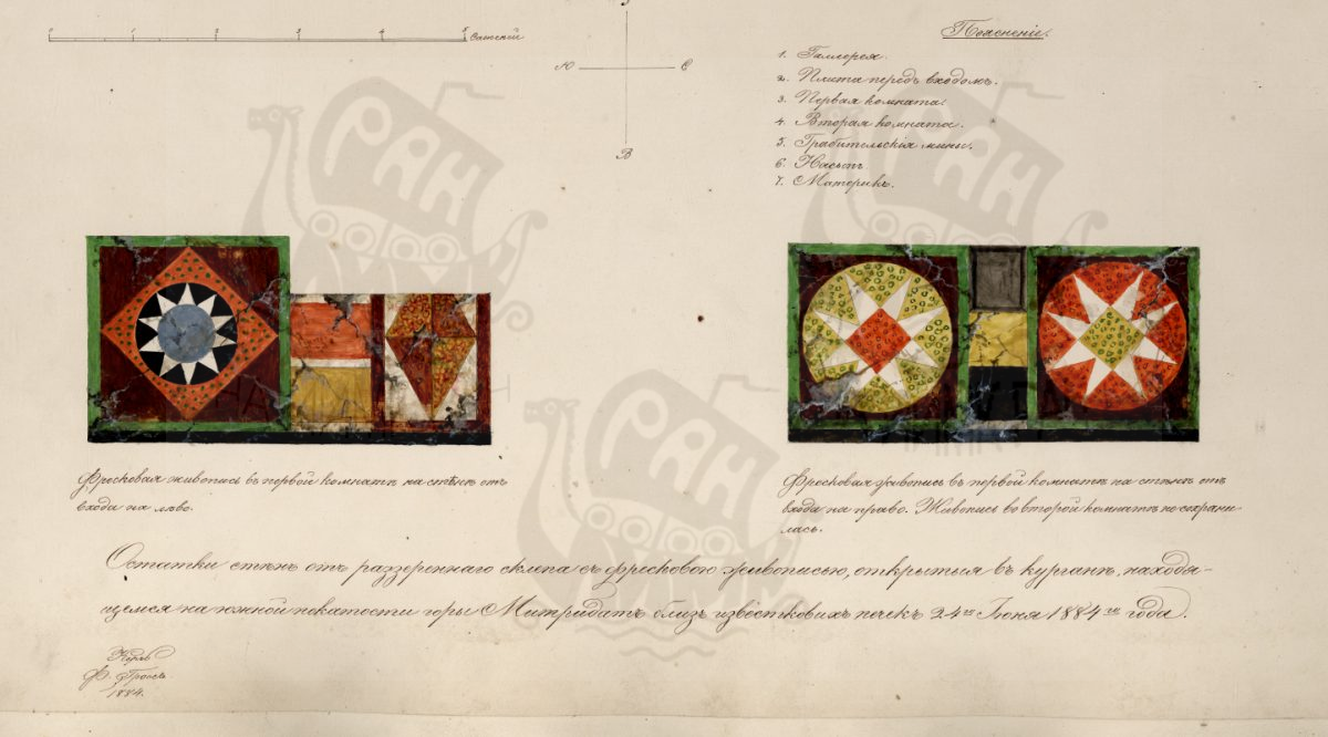 Гросс Ф. И. Склеп 1884 г. с росписью в инкрустационном стиле. План, разрез, рисунки росписей, открытых в первой камере. |
