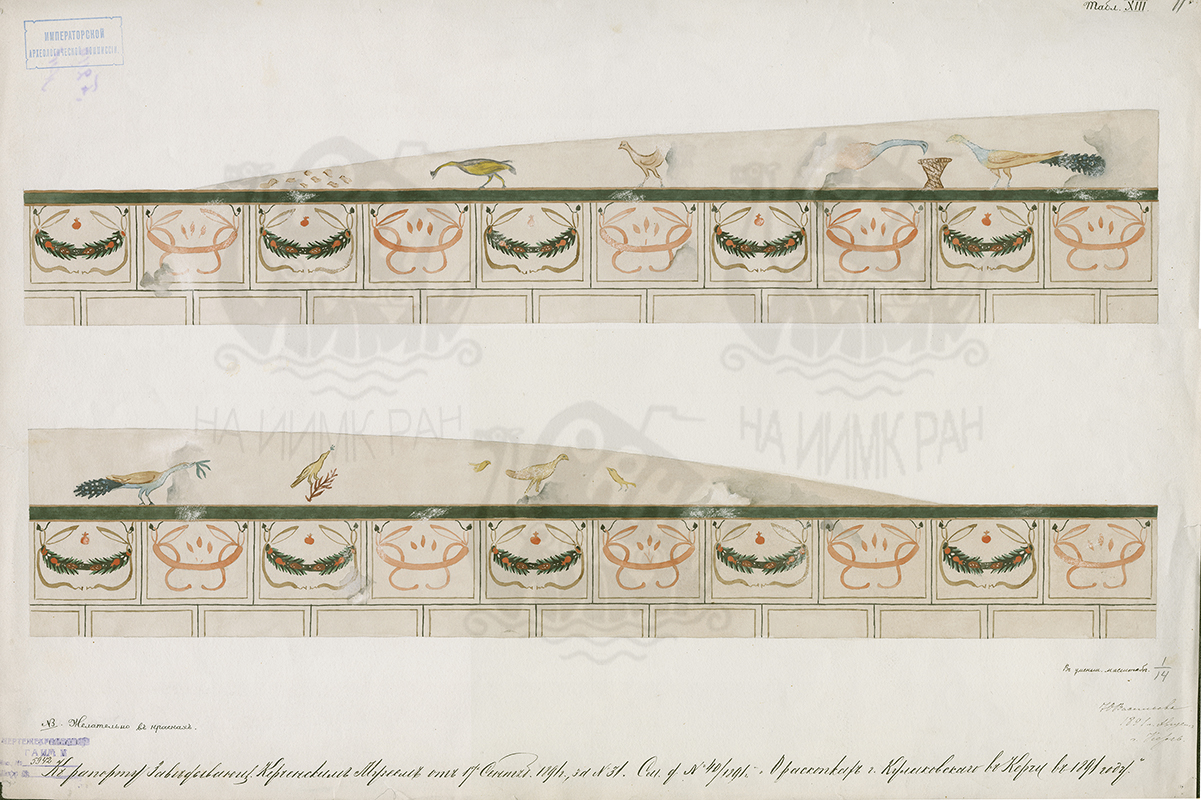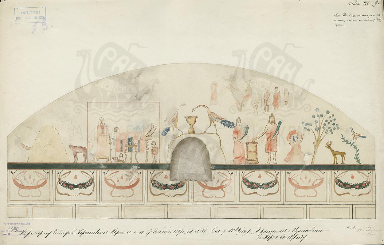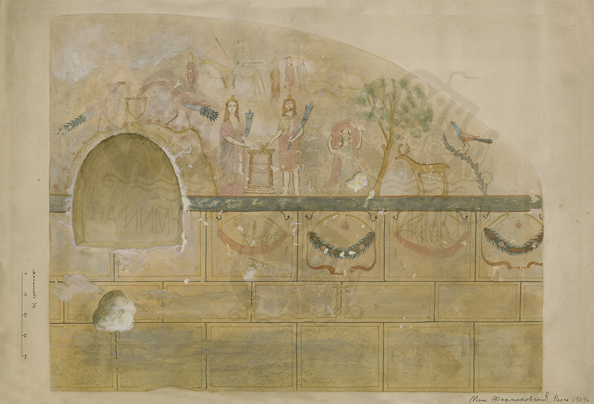 Деталь росписи в люнетке задней стены склепа с изображением сцены жертвоприношения. Рисунок М. В. Фармаковского, 1909 г. |