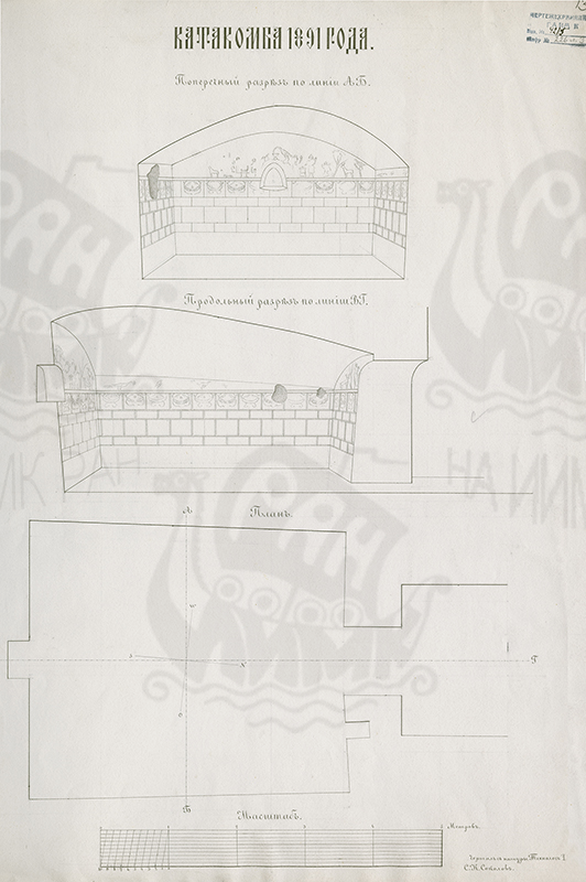 План и разрез склепа 1891 г. Выполнен технологом С. К. Соколовым. |