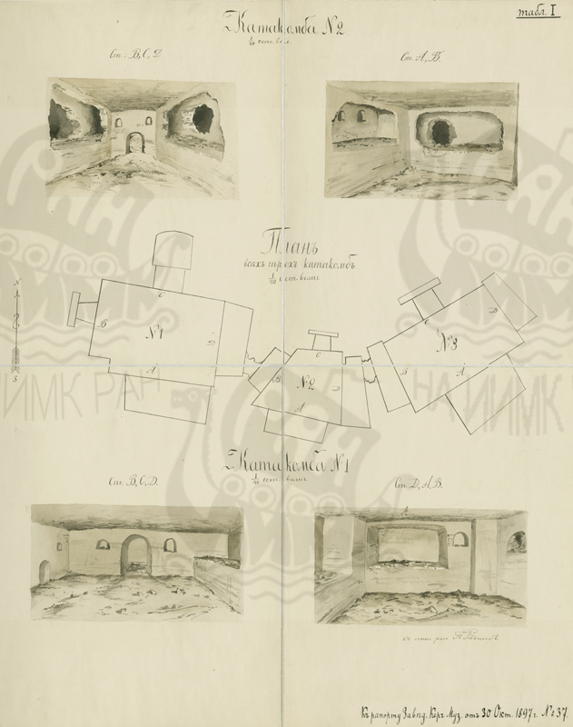 «План 3 катакомб во дворе Заварзиной и виды первых двух из них». Исследования К.Е. Думберга в Керчи в 1896 г. Приложение к рапорту № 37 заведующего Керченским музеем от 30 октября 1897 г. Табл. I. Рисунок П. Ридигера.