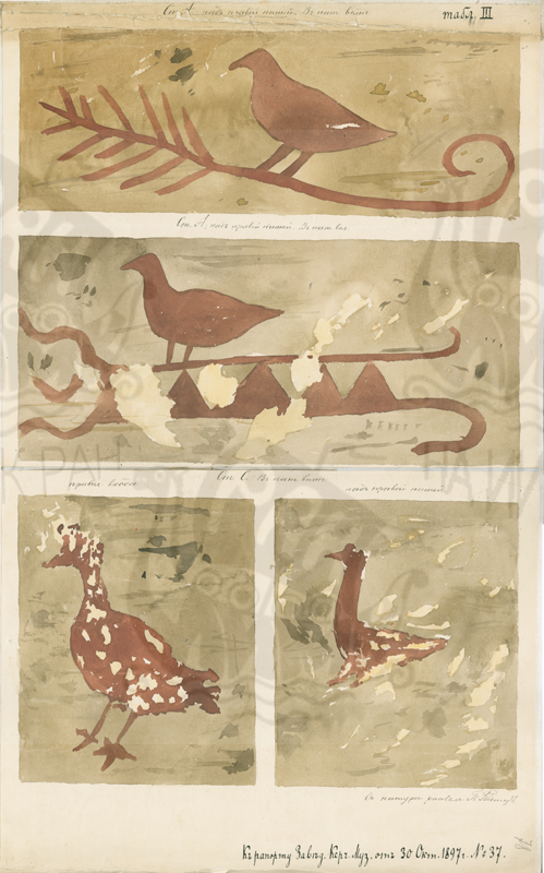 «Живопись из 3 катакомбы во дворе Заварзиной, в нат. величину». Исследования К.Е. Думберга в Керчи в 1896 г. Приложение к рапорту № 37 заведующего Керченским музеем от 30 октября 1897 г. Табл. III. Рисунок П. Ридигера.