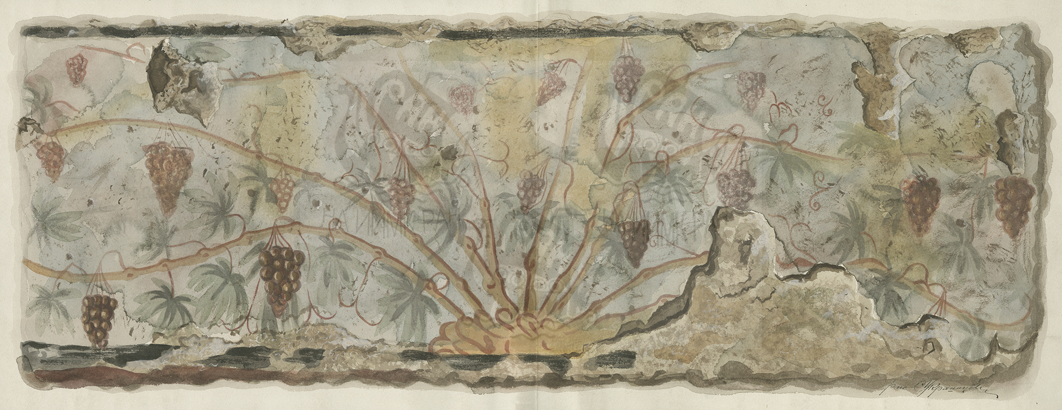 Роспись на стене каменного саркофага, найденного в склепе 1902 г. Рисунок С. Украинцева.