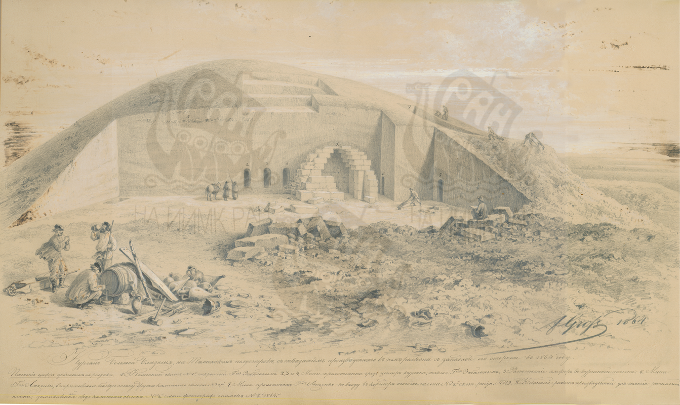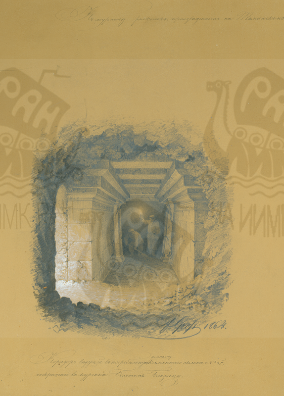 «Коридор, ведущий в погребальную комнату каменного склепа № 2, открытого в кургане Большом Близнеце. К рапорту о раскопках, произведенных на Таманском полуострове с 17 августа по 15 октября 1864 г.». Рисунок Ф. И. Гросса 1864 г. из альбома к отчету о раскопках ИАК в 1863-1864 гг. Картон, карандаш. 44х61 см. Фрагмент.