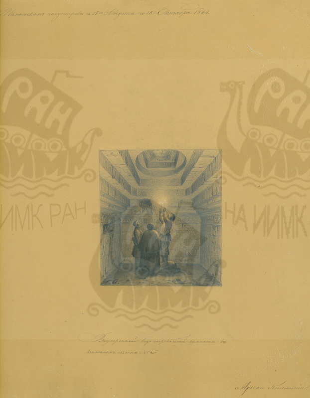 «Внутренний вид погребальной комнаты в склепе № 2. К рапорту о раскопках, произведенных на Таманском полуострове с 17 августа по 15 октября 1864 г.». Рисунок Ф. И. Гросса 1864 г. из альбома к отчету о раскопках ИАК в 1863-1864 гг. Картон, карандаш. 44х61 см. Фрагмент. |