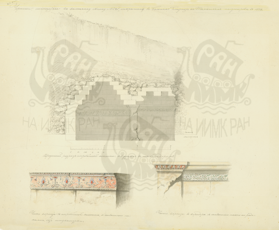 «Чертежи, относящиеся к каменному склепу № 2, открытому в Большом Близнице на Таманском полуострове в 1864 г. Продольный разрез погребальной комнаты с ведущим в нее коридором. Часть карниза в погребальной камере с росписью по камню без штукатурки. Часть карниза в коридоре с росписью по камню без штукатурки». Рисунок из альбома к отчету о раскопках ИАК в 1863-1864 гг. Картон, карандаш. 44х61 см.