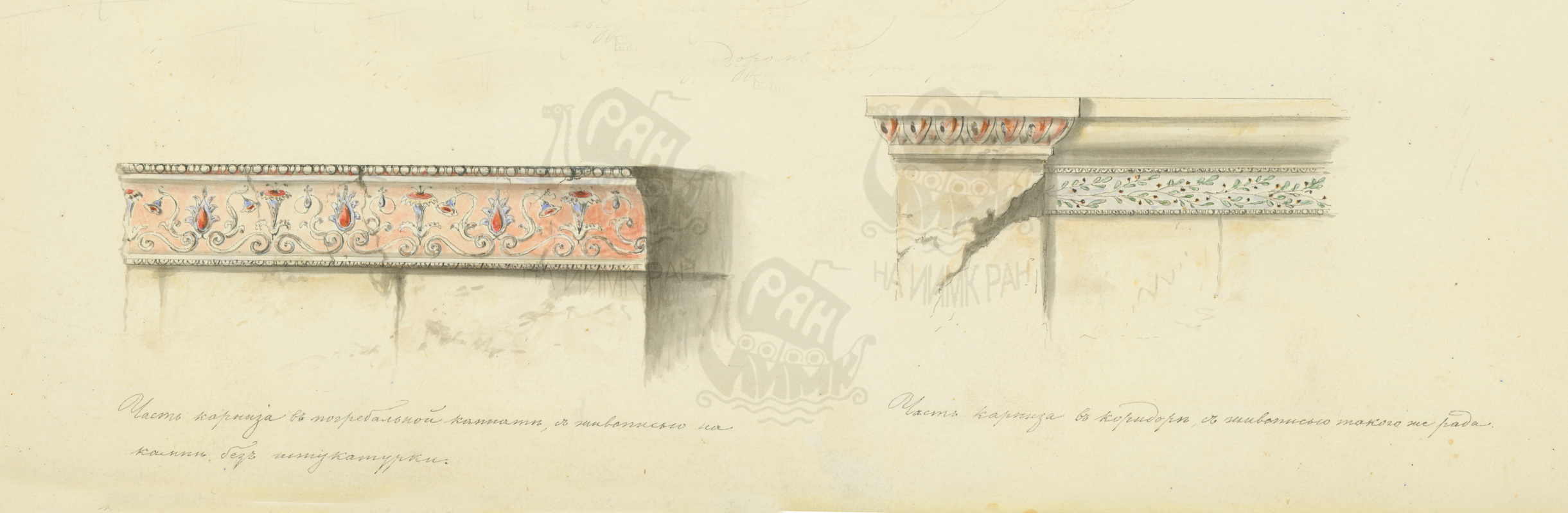 «Чертежи, относящиеся к каменному склепу № 2, открытому в Большом Близнице на Таманском полуострове в 1864 г.». Рисунок из альбома к отчету о раскопках ИАК в 1863-1864 гг. Картон, карандаш. 44х61 см. Фрагмент. «Часть карниза в погребальной камере с росписью по камню без штукатурки; часть карниза в коридоре с росписью по камню без штукатурки»