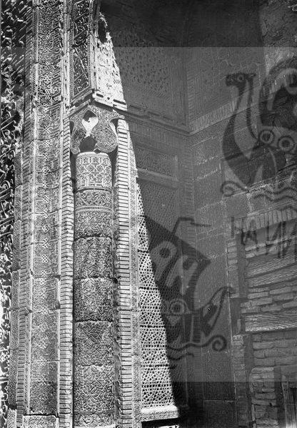 Узгент. Киргизская ССР. Южный мавзолей: портал-резьба колонны.