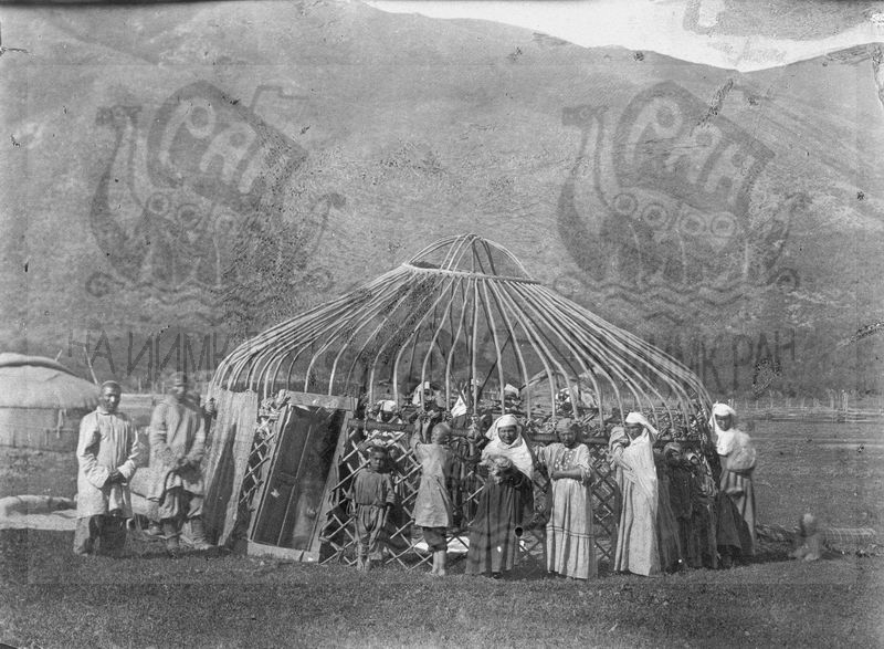 Семипалатинская область. Вид непокрытой юрты (кереге), возле которой стоят кочевники.