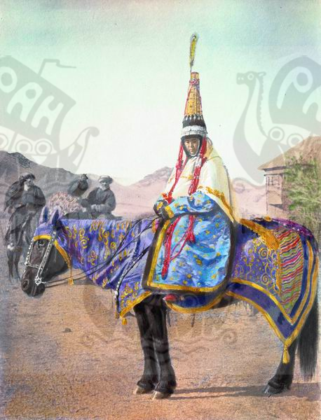 Семипалатинская область. Киргизская невеста в свадебном наряде на лошади, обряженной в попону (снимок раскрашен).