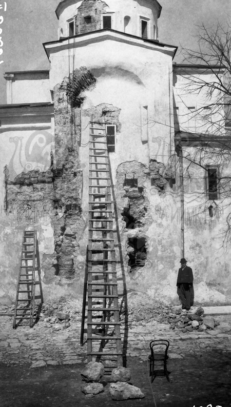 Керчь. Таврическая губ. Поездка П. П. Покрышкина 1909 года для осмотра церкви Иоанна Предтечи IX-X в.: выступ южного фасада во время ремонтных работ