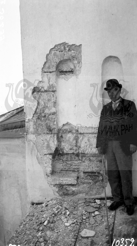 Керчь. Таврическая губ. Поездка П. П. Покрышкина 1909 года для осмотра церкви Иоанна Предтечи IX-X в.: деталь восточного фасада - часть арочек с отбитой штукатуркой.
