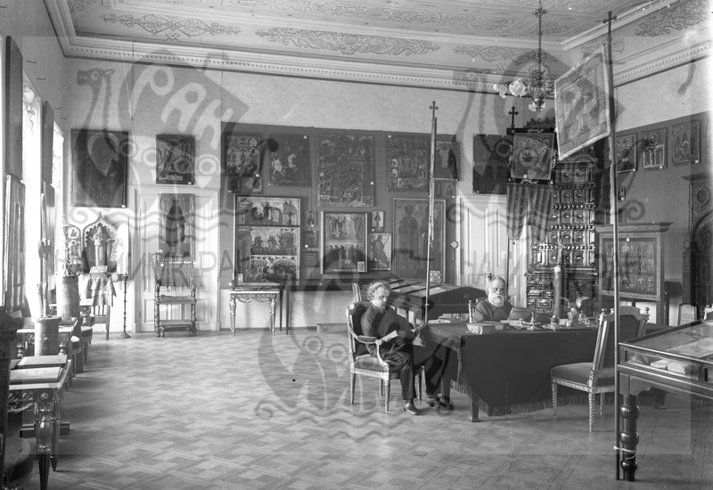 Новгород: покой в церковном древлехранилище. За рабочим столом А. И. Конкордин, Н. В. Никифоровский. Из фонда Ленинградских реставрационных мастерских.