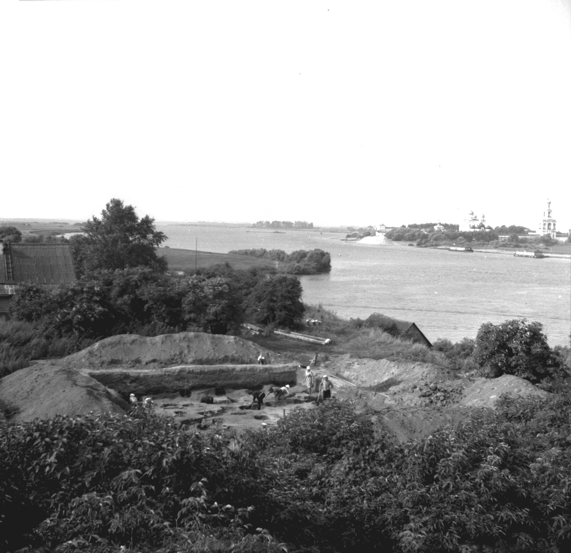Вид на мыс Городища с р. Волхов. Раскоп 1978 г. на северном берегу Сиверсова канала. Материалы Новгородской областной экспедиции. Снимок Е. Н. Носова.