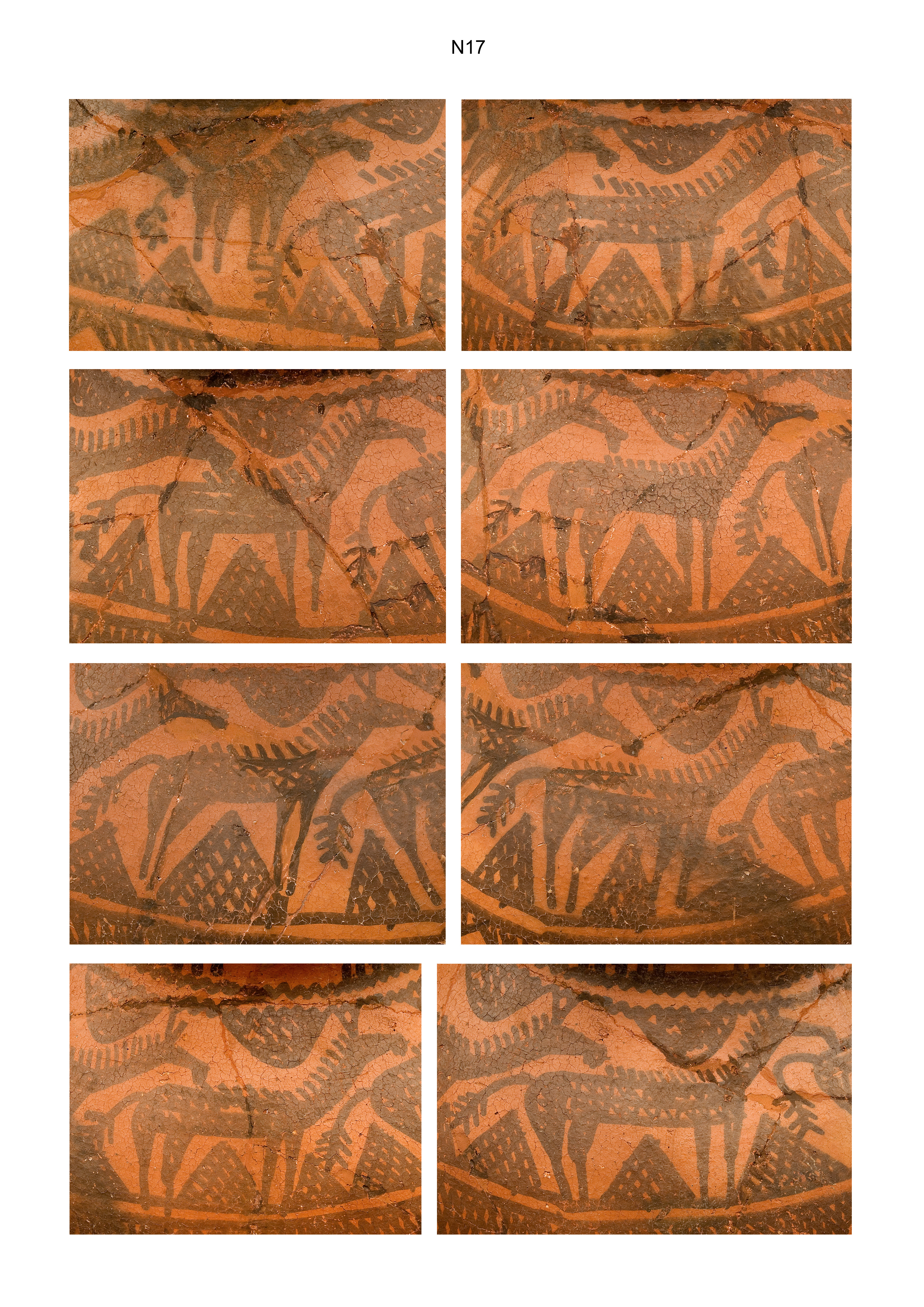 По пышности инвентаря и размерам выделяется курган N7. В этой гробнице в строгом порядке были поставлены 65 прекрасно раскрашенных гидрий и другие сосуды, которые в свое время были заполнены разными припасами и напитками. На одной великолепной краснолощёной гидрии черной краской выполнено полотно с изображением идущих вереницей лошадей со стройными, тонкими ногами, маленькими головами и торчащими ушами, что характерно для породистых скакунов. Иконографический анализ этих рисунков свидетельствует, что здесь изображены породистые, молодые кони со стриженными гривами и плетёнными в косы хвостами (рис. 1). Анализ погребального обряда по данным раскопок курганов Неркин Навер эпохи средней бронзы выявил множество элементов индоевропейской идеологии.