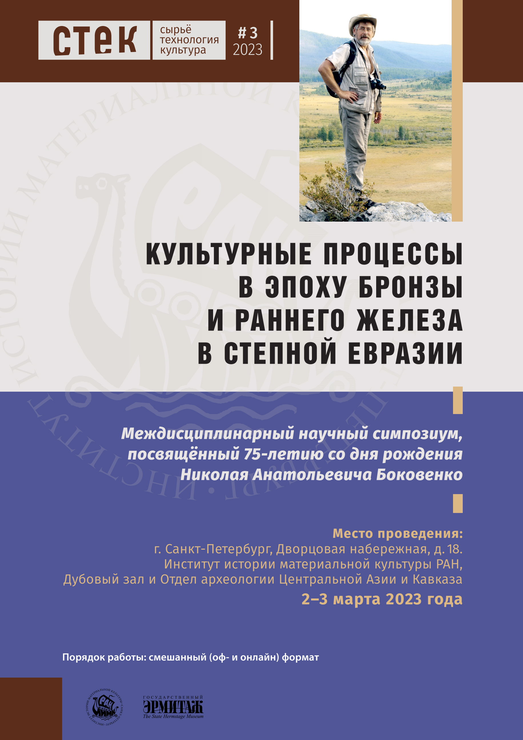 Рады представить вам программу междисциплинарного научного симпозиума СТЕК№3, который приурочен к 75-летию известного археолога, специалиста по археологии эпохи бронзы и раннего железа Южной Сибири и Центральной Азии, старшего научного сотрудника Отдела археологии Центральной Азии и Кавказа ИИМК РАН, к.и.н., доцента Николая Анатольевича Боковенко.