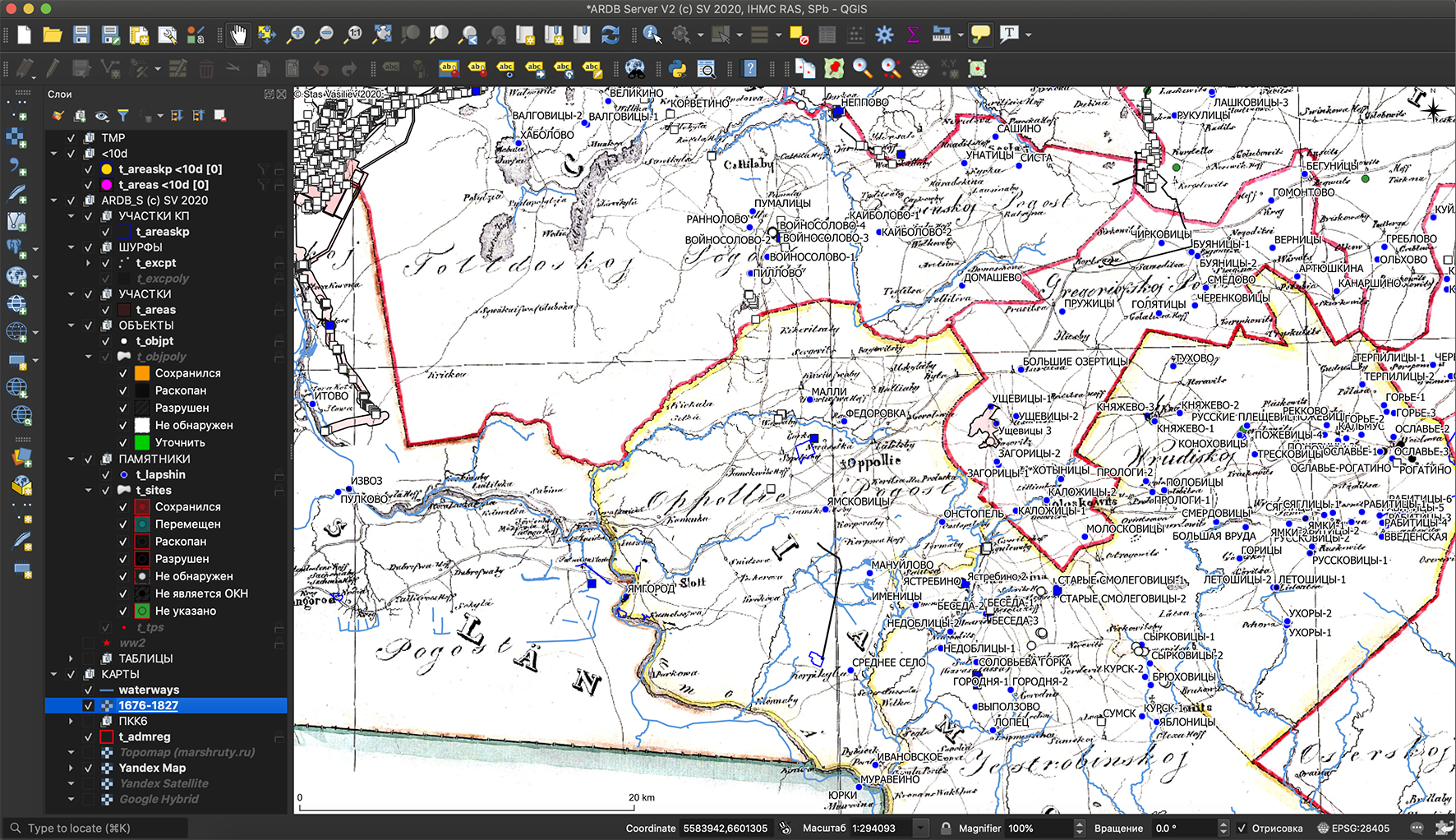 Карта бывших губерний Иван-Города, Яма, Капорья и Нэтеборга по состоянию на 1676 год, авторства майора Биргенгейма (составлена в 1827 г.) в рабочей среде археологической карты Ленинградской области (проект «Археограф (ARDB)»), в интерфейсе QGIS 3.4.