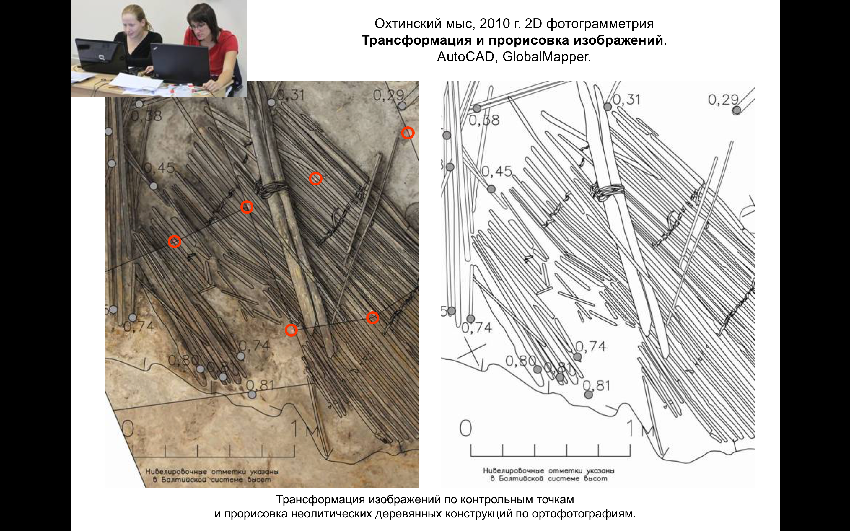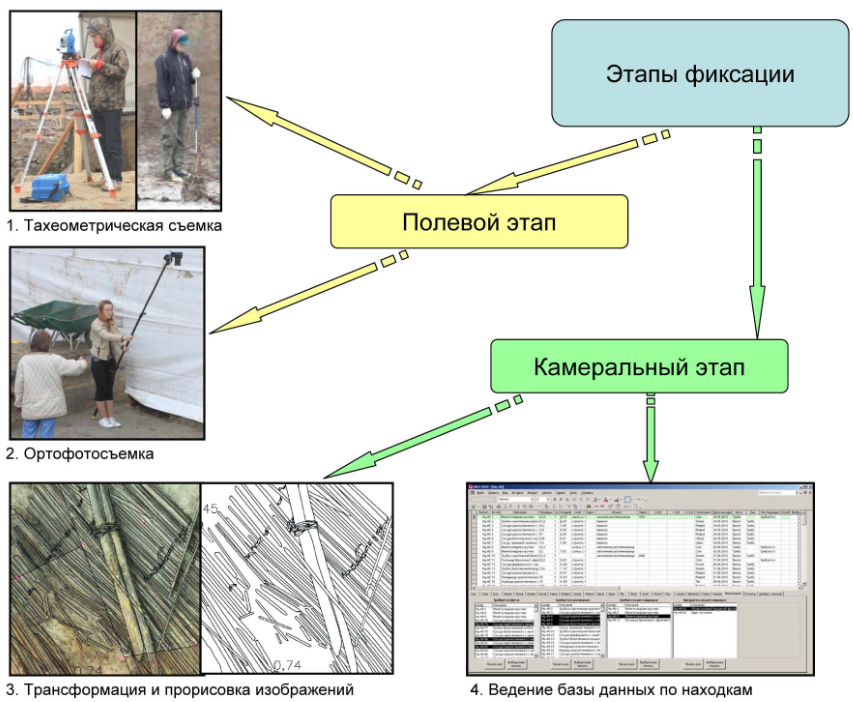 Большое внимание уделяется совершенствованию методов полевой фиксации на археологических раскопках с применением фотограмметрии, мировая практика использования которой насчитывает уже не один десяток лет. Однако бурное развитие этот метод получил в 2000-е гг. на Западе в связи с началом широкого использования тахеометров на раскопках и появлением цифровой фотографии. Периодическое тестирование сотрудниками ИИМК РАН фотограмметрического метода на небольших объектах и поиск оптимальной последовательности действий привели к выработке методики электронной фиксации, полностью отработанной на масштабных раскопках на Охтинском мысу в С.-Петербурге в 2010 г.