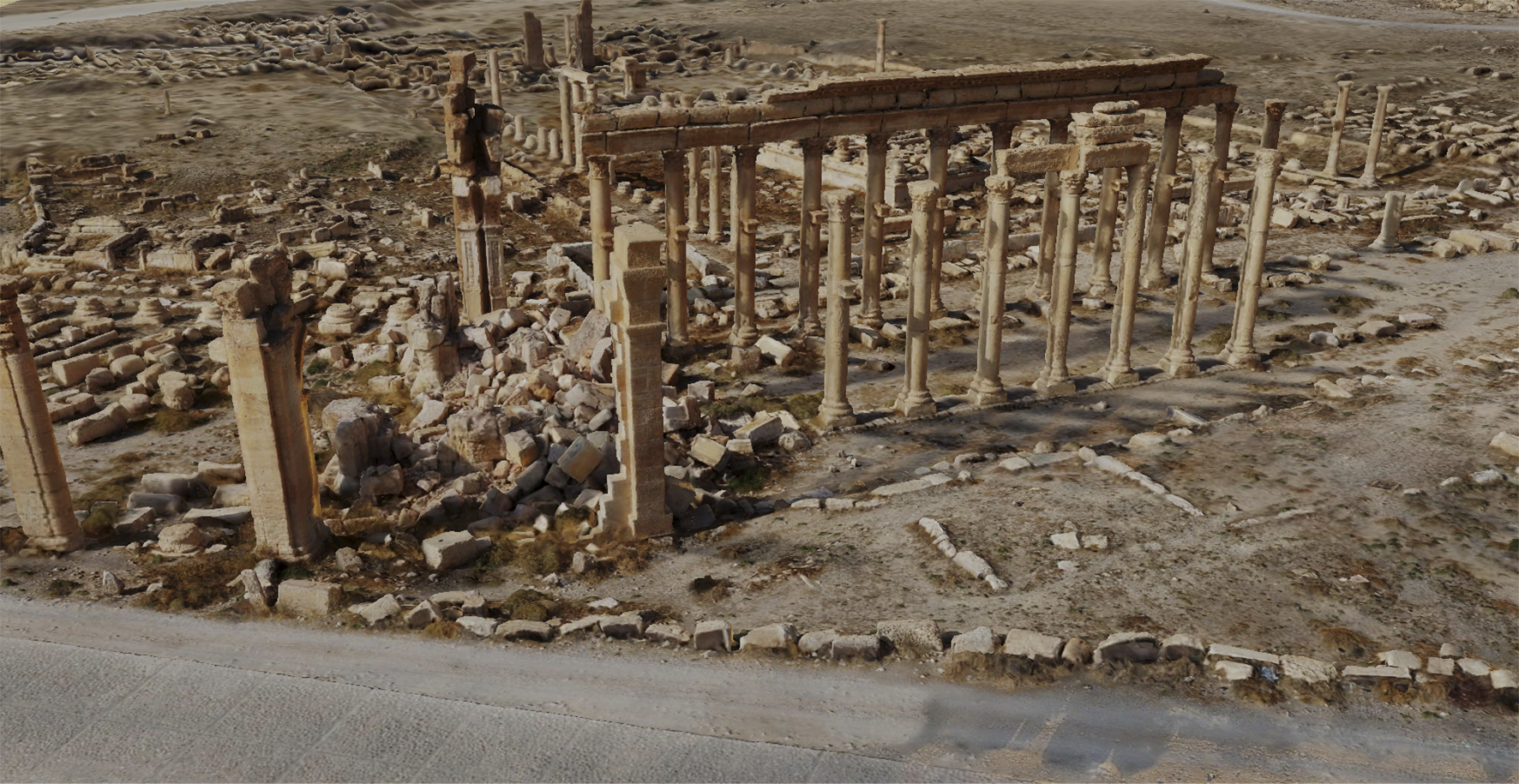 | БПЛА коптерного типа при съёмке теменоса храма Бела (Пальмира, Сирия, 2019 г.) | Фрагмент 3D модели Большой колоннады Пальмиры с разрушенной Монументальной аркой |