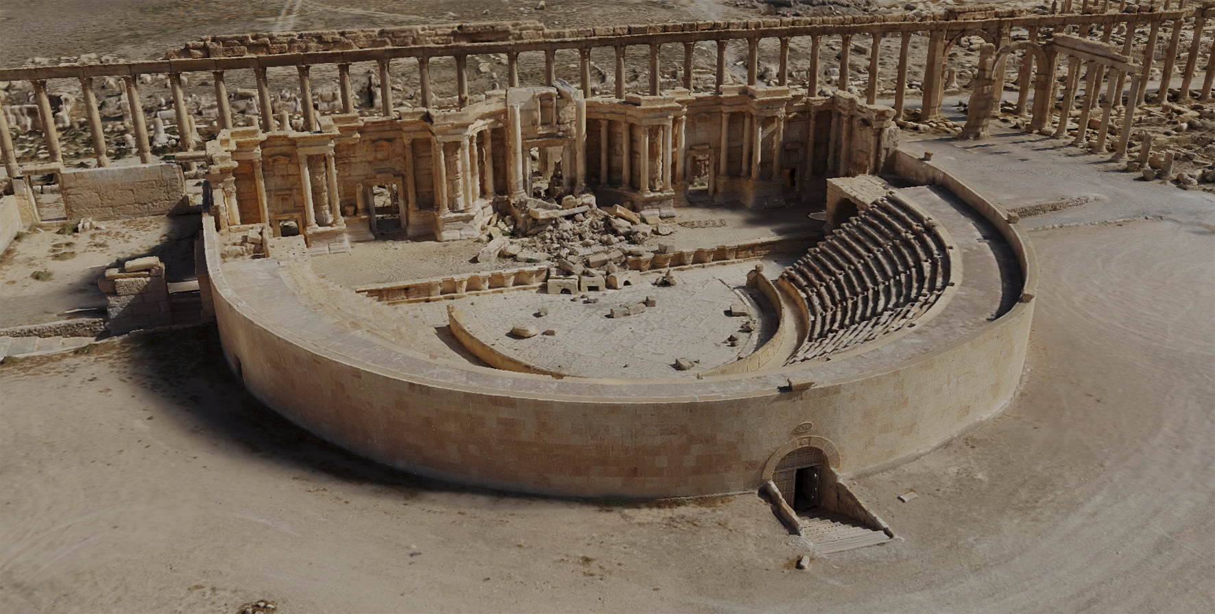 | Фрагмент 3D модели Большой колоннады Пальмиры с разрушенной монументальной аркой | Фрагмент 3D модели Пальмиры, общий вид на город со стороны храма Бела |