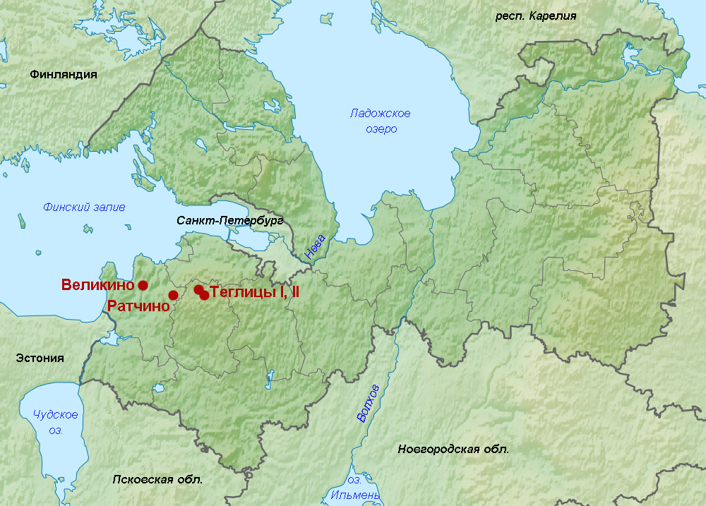 Вторая группа – захоронения XII в. из некрополя Ратчино I – отличается невысокими расплывчатыми курганами без каменных обкладок, погребения в которых совершены на горизонте, с восточной или меридиональной ориентировкой. В инвентаре сочетается балтийская, древнерусская и скандинавская культура. В женском уборе преобладают предметы, характерные для территории соседней Эстонии, хотя уже со второй половины XII века среди находок появляются древнерусские украшения и керамика. В отличие от классических древнерусских курганов первой группы, возникшими фактически в чистом поле, на неосвоенном ранее водоразделе, памятники типа Ратчино топографические связаны с очагами освоения I тыс. н.э., примыкающими к истокам рек. Здесь им предшествуют грунтовые и каменные могильники с сожжениями, из которых, к сожалению, выделить ДНК пока не удается. Считается, что это погребальные памятники автохтонного прибалтийско-финского населения, родственного эстам (чуди) и води или, что весьма вероятно, самих древних вожан XI – XII вв.