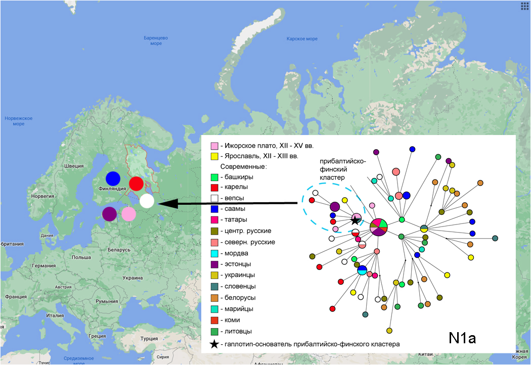 Интересными и в то же время ожидаемыми оказались результаты для гаплогруппы N1a1 (рис. 2). Кроме изученных в данной работе образцов, в филогенетическую сеть вошли гаплотипы 250 индивидов, как современников, так и археологические образцы из Ярославля (XII—XIII вв.), полученные лабораторией (неопубликованныеданные) и опубликованные данные из других работ. На филогенетической сети выделился кластер, который объединил образцы из Великино и Ратчино с современными вепсами, саамами, карелами и эстонцами, то есть с соседними прибалтийско-финскими народами. Возраст общего предка в прибалтийско-финском кластере оценивается в 1100±400 лет. Примечательно, что результаты молекулярно-генетического исследования совпадают с археологической трактовкой могильников Ратчино и Великино как памятников прибалтийско-финского населения и отражают, видимо, тесные межпопуляционные связи населения Прибалтики, северного и южного берегов Финского залива и восточного Приладожья в раннем средневековье.