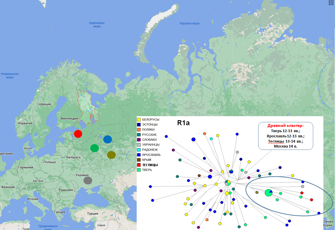 Не менее интересными оказались результаты филогенетического анализа гаплотипов группы R1a (рис. 3). На филогенетической сети выявлен кластер, объединивший образцы из Теглиц I с образцами из древнерусских захоронений Твери, Ярославля XII – XIII вв. и Москвы XIV в. Неожиданностью оказалось наличие у индивидов из могильника Теглицы I гаплогруппы E1b1b1(М35.1). Ее носители в наши дни сконцентрированы преимущественно в балкано-карпатском регионе, однако отдельные представители встречаются дисперсно фактически по всей Европе. За пределами Средиземноморья и Карпато-Балканского региона они везде в Европе немногочисленны, но географически распространены очень широко. В последние годы носители данных генетических вариантов всё чаще выявляются при генетическом исследовании археологических образцов, что даёт основание предполагать большую распространенность этой гаплогруппы в европейских популяциях древности и средневековья.