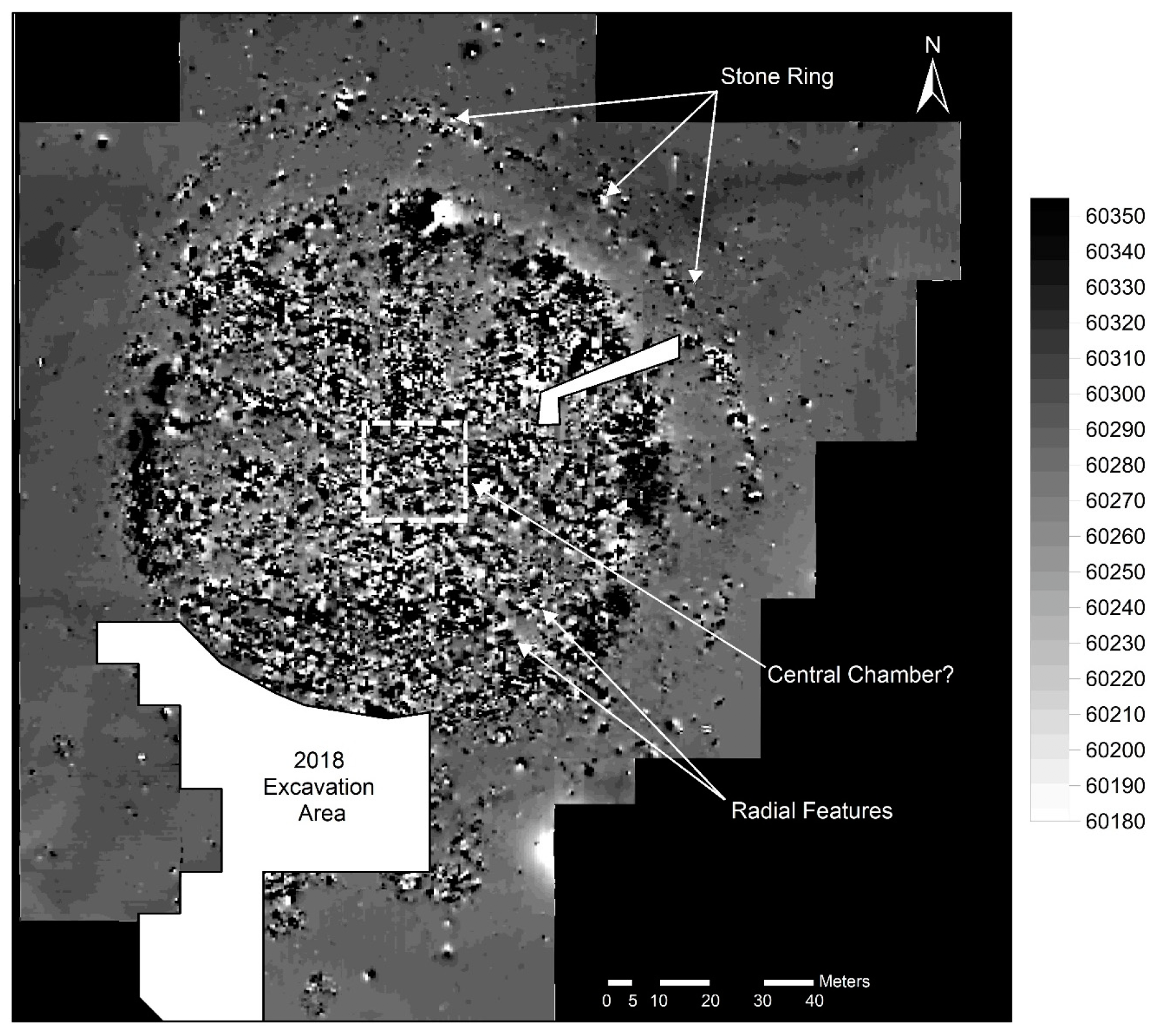 Данные геомагнитной разведки на кургане Туннуг 1. Отчетливо просматривается радиальная структура основной насыпи и кольцо окружающих ритуальных объектов. (по Caspari et al. 2019)