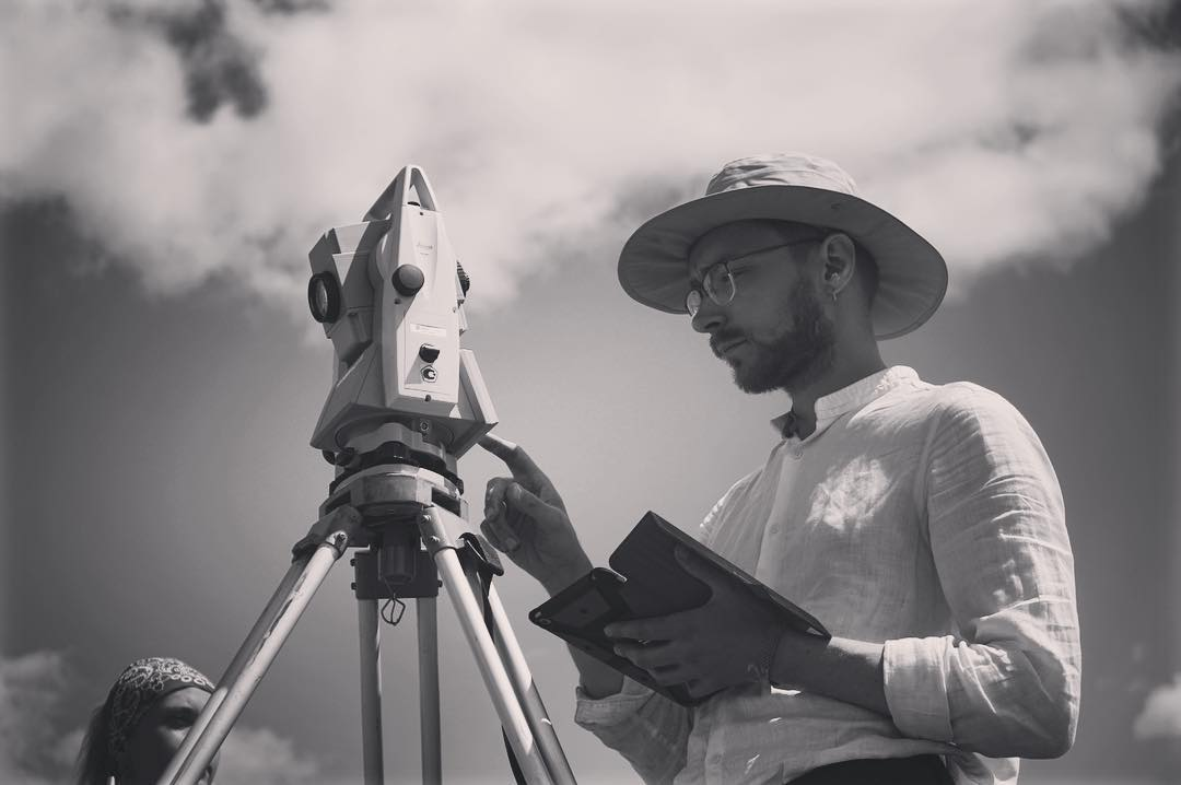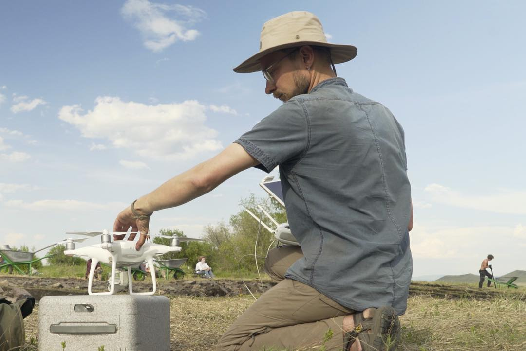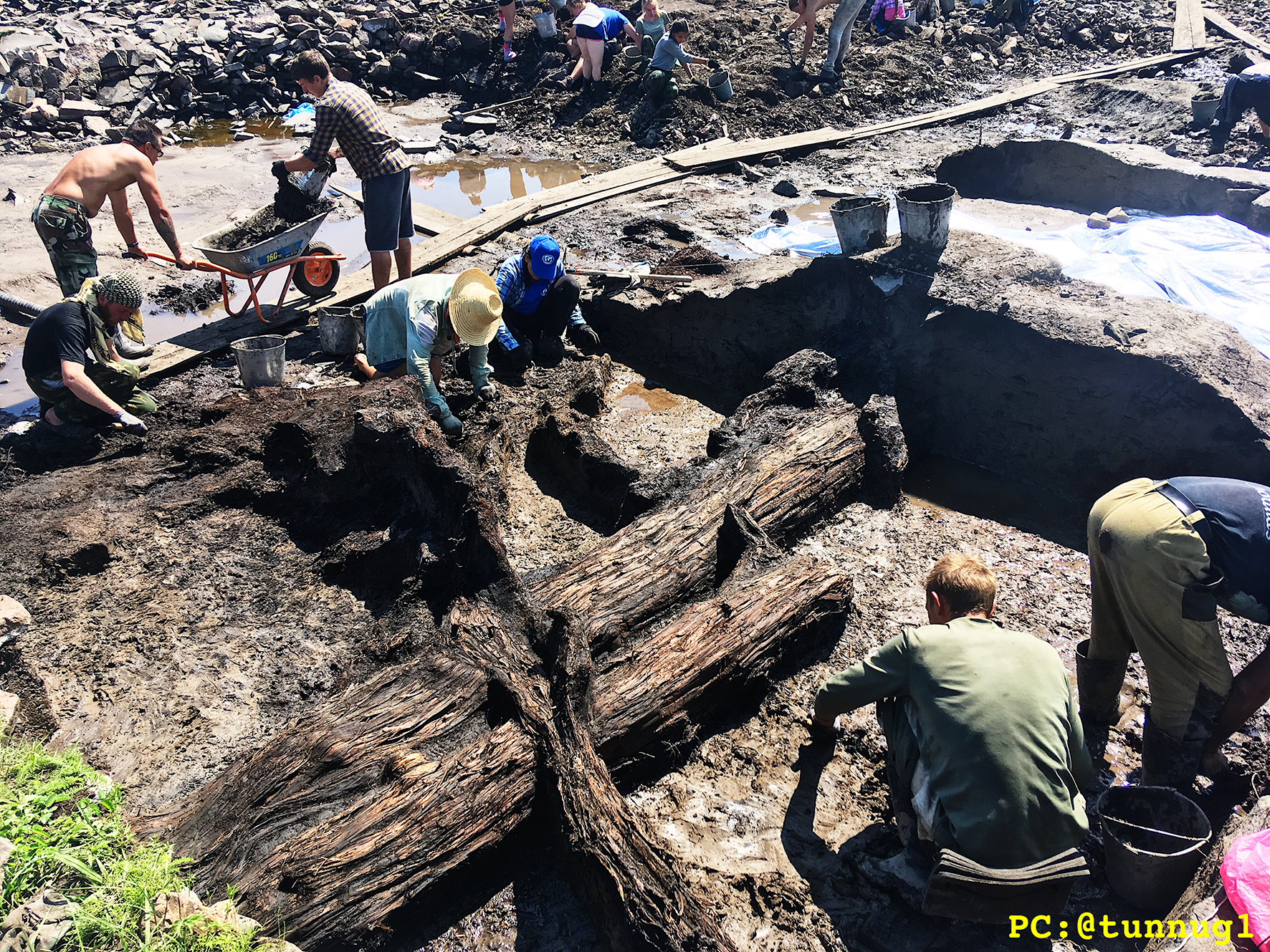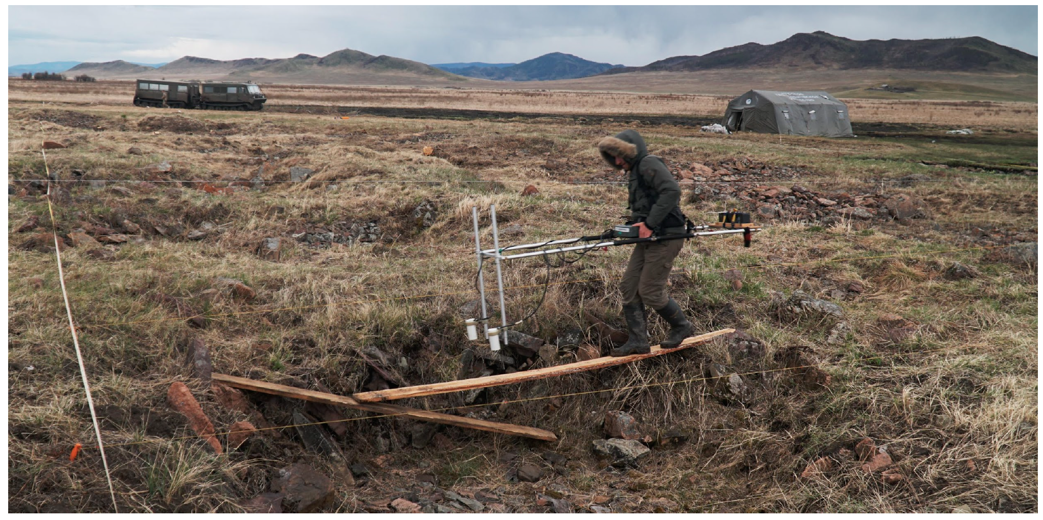 Процесс геомагнитной съёмки на территории основной насыпи кургана Туннуг 1. Для обеспечения возможности непрерывного движения по поверхности насыпи над регулярными «провалами», покрывающими тело кургана были сооружены специальные деревянные мостки, которые позволили инженерам перемещать прибор с равномерной скоростью. 2019 г.