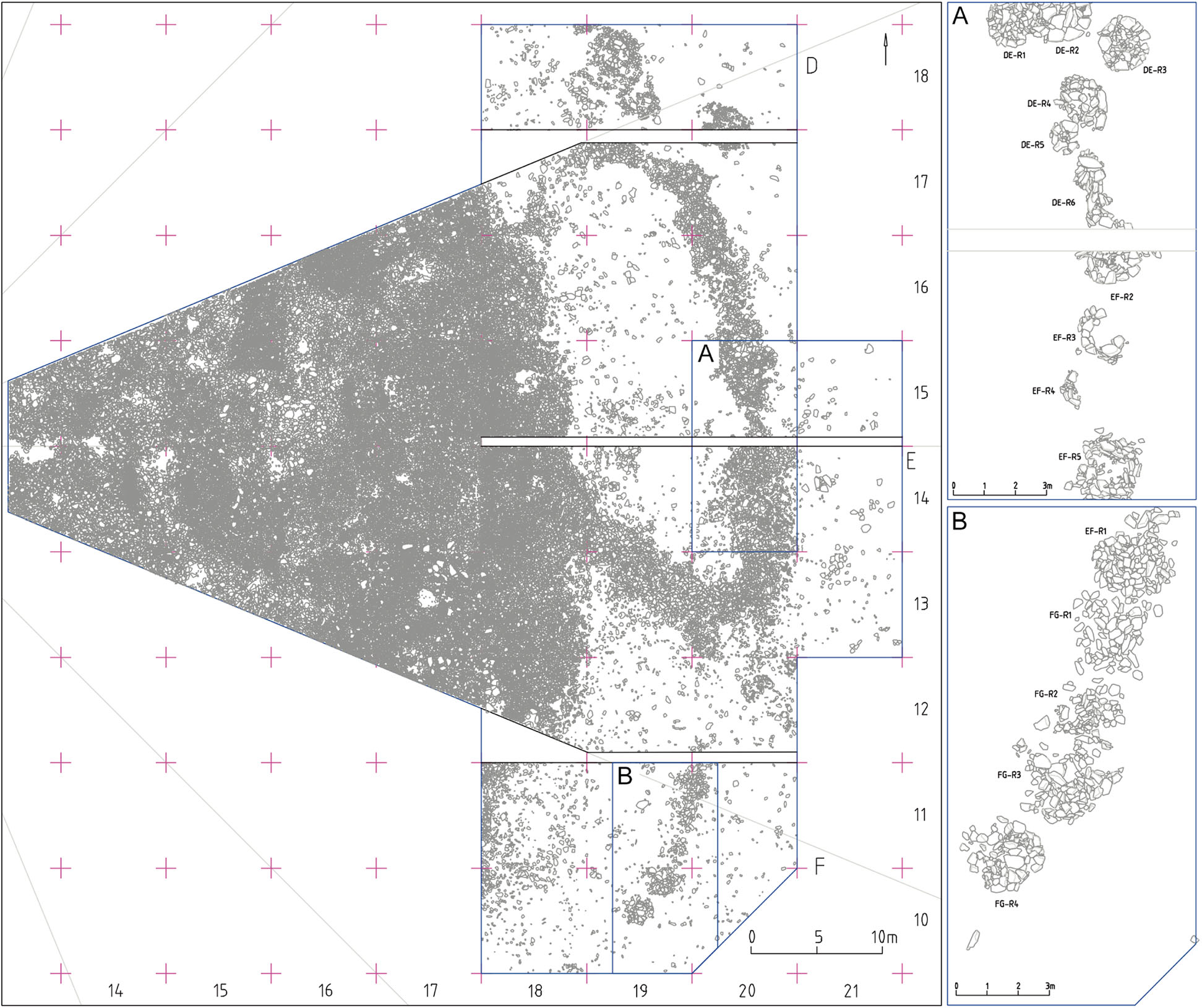 Ключевым условием для успешной реализации всех перечисленных естественнонаучных подходов является точно подобранная методика полевых исследований и фиксации. Курган разделен на 16 секторов, линии которых проведены через условный центр насыпи и обозначены буквами латинского алфавита от A до P. Раскопки ведутся по секторам, с фиксацией разрезов по осевым линиям. На конец 2020 г исследованы восточные и юго-восточные сектора в границах D-H. Дополнительно, весь памятник «накрыт» сеткой квадратов 8х8 м, в рамках которой исследуется площадь периферии. Такая двойная система позволяет успешно организовать работы в условиях сложной стратиграфии наслаивающихся друг на друга каменных насыпей и четко выделять последовательность формирования периферийных объектов. Естественно, каждый объект разрезается своим собственным профилем, а также, при необходимости, проводятся дополнительные разрезы, проясняющие локальные вопросы.
