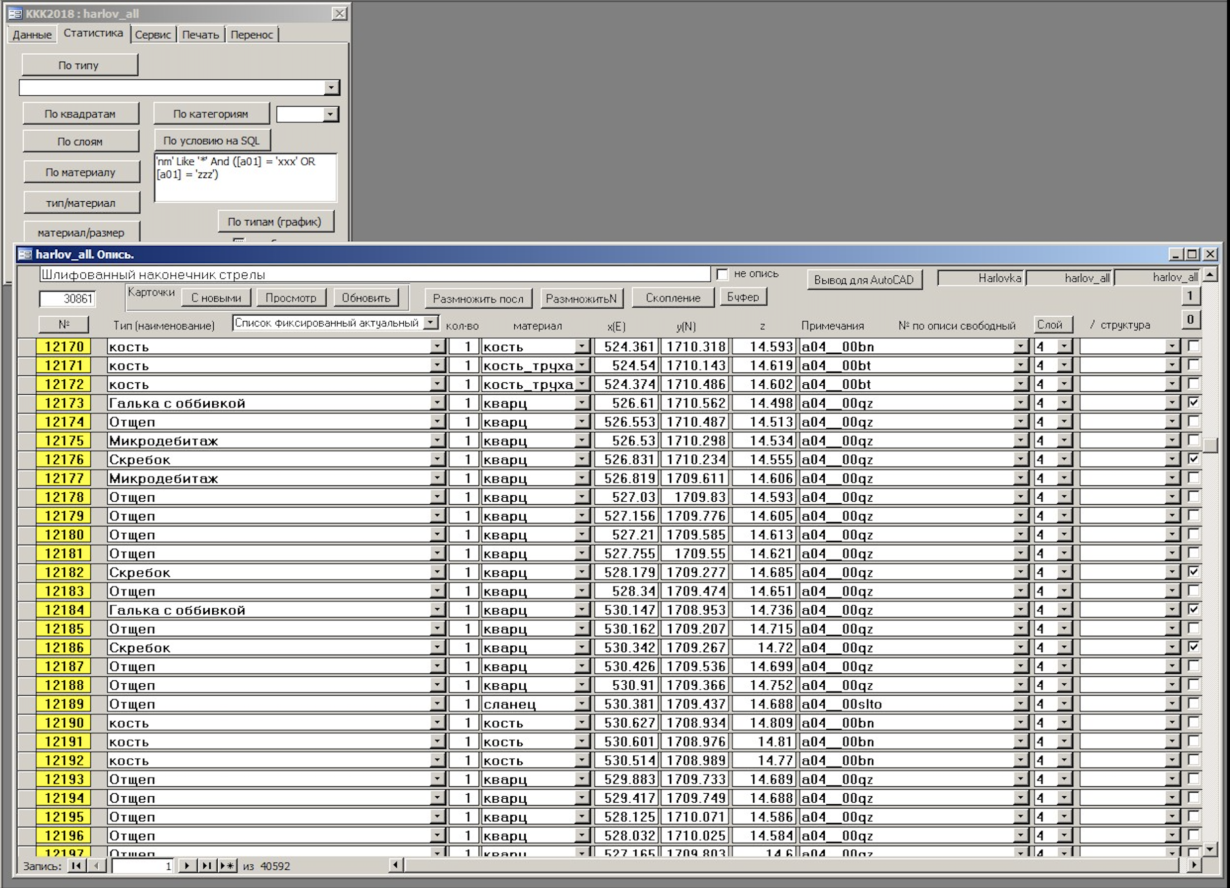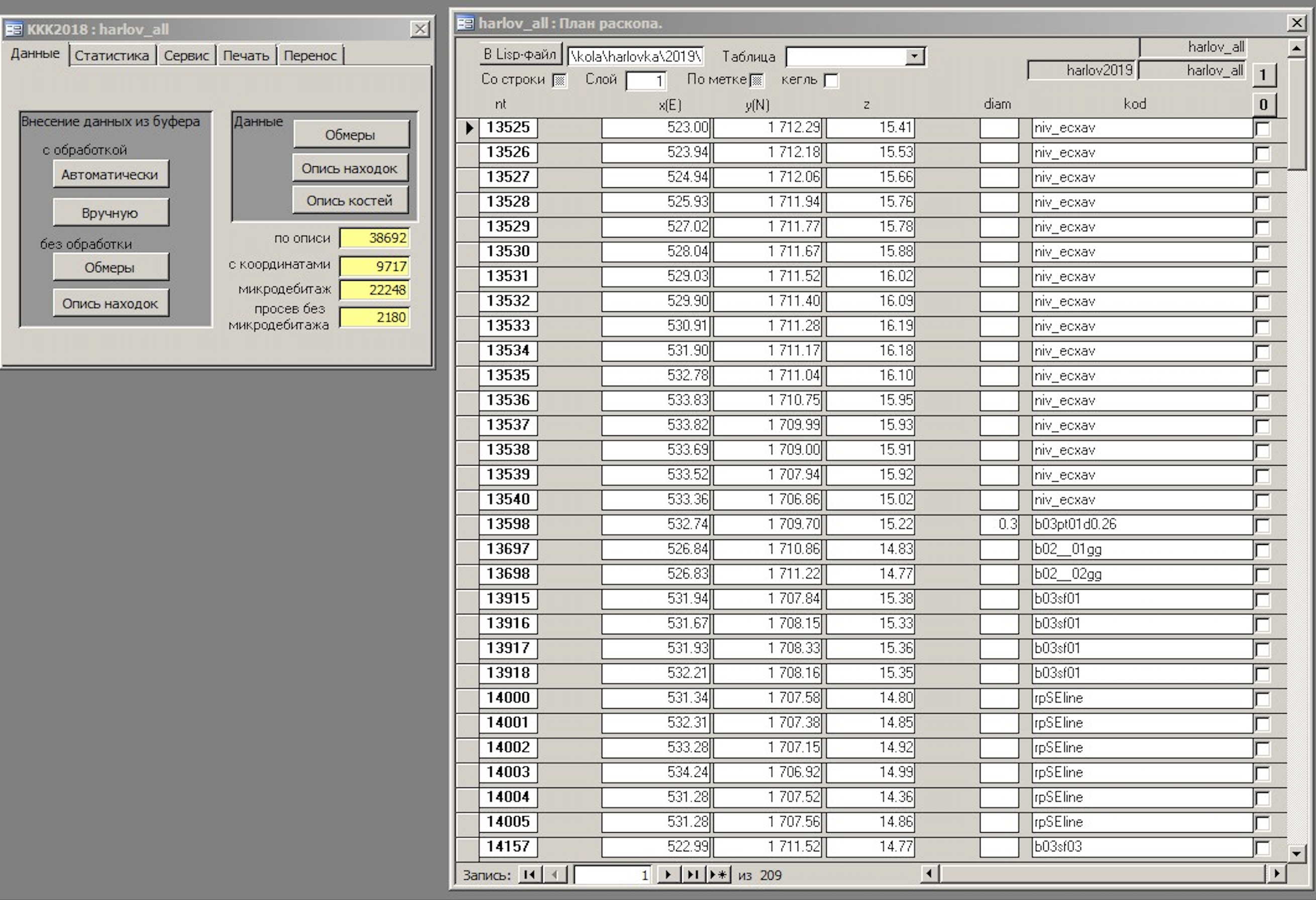 6. При переносе данных с тахеометров в БД автоматически строится опись находок по кодам, введённым при фиксации. Соответствие кодов реальным значениям устанавливается в БД самим пользователем. В дальнейшем опись дополняется по результатам камеральной обработки материала. Размеры находок переносятся прямо с электронного штангенциркуля Mitutoyo в опись.