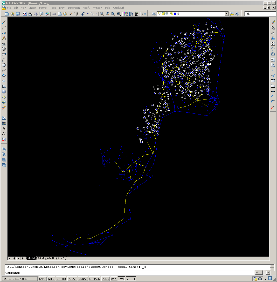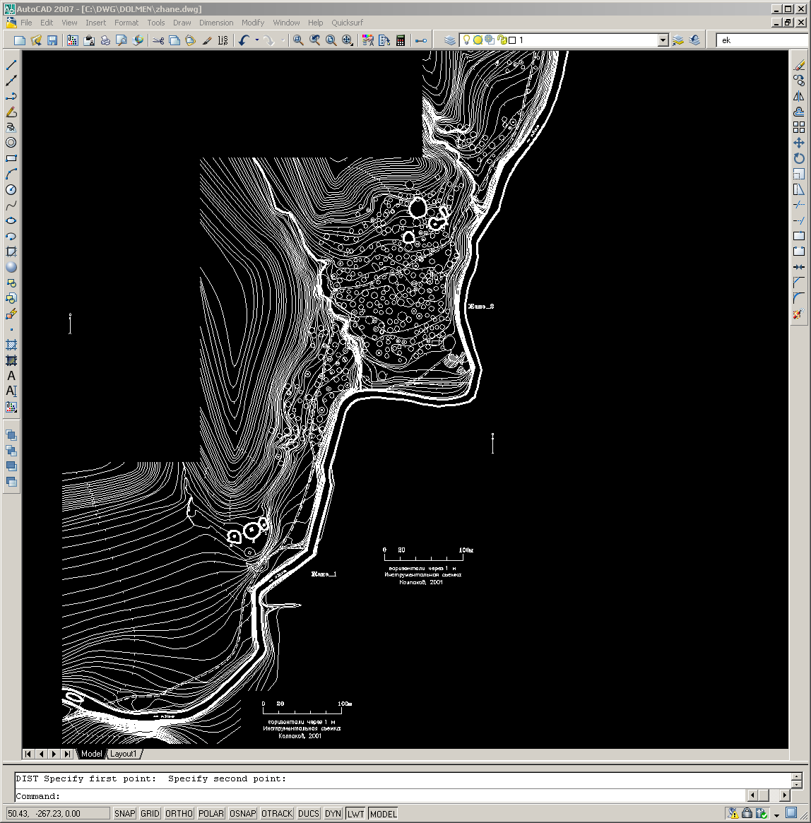3. Из базы данные съёмки переносятся в программу AutoCAD. Реализовано это следующим образом: БД формирует файл на языке AutoLISP, который загружается в AutoCAD и исполняется. При этом в чертёж автоматически вносятся не только снятые точки с информацией о них, но и вычерчиваются условно геометрически правильные объекты, например «круглые в плане» курганы, трассы дорог, и т.п., а также линии террас, контуры объектов и т.п. Геометрически неправильные объекты дочерчиваются в AutoCAD по снятым точкам.