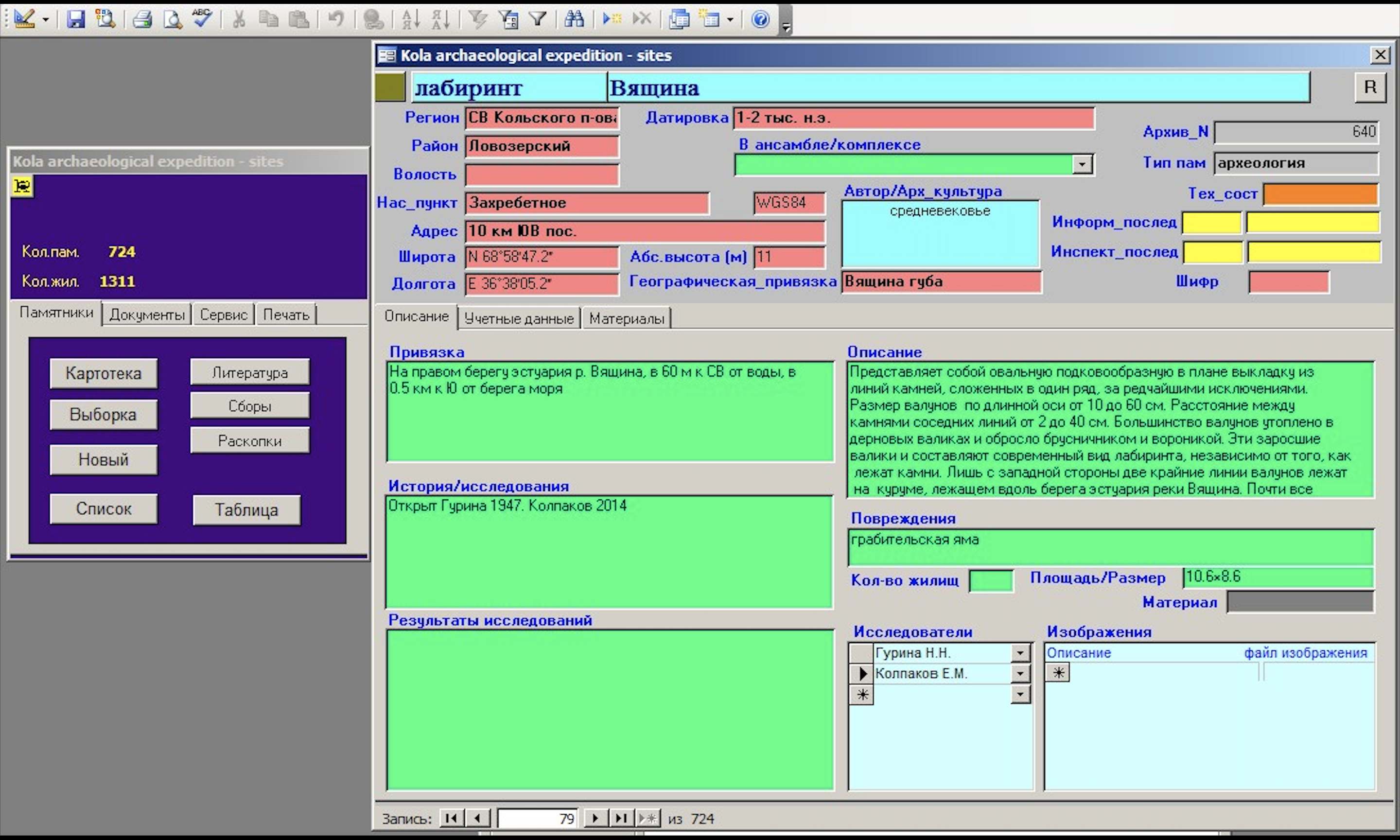 4. Данные по памятникам заносятся в отдельную базу данных (Microsoft Access), пригодную для использования органами охраны памятников. Из данных, внесённых в базу, автоматически формируется описание памятников в отчёт о разведках.
