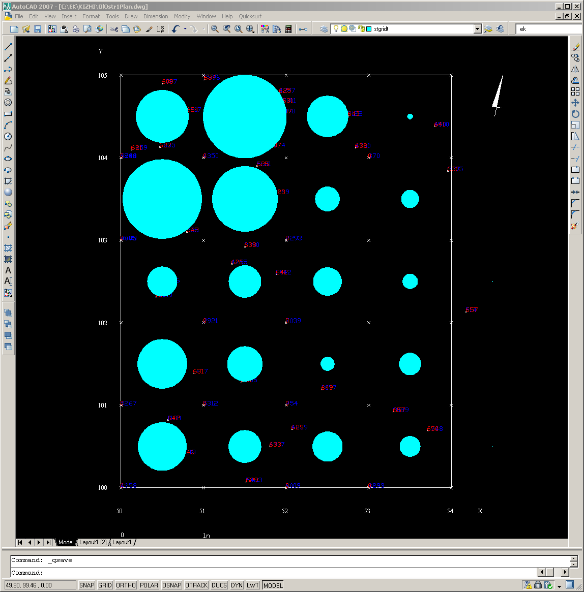 7. БД позволяет получать не только любые статистические данные по любым параметрам, но и выводить специальный чертёж в AutoCAD, графически показывающий плотность распределения находок по квадратам.